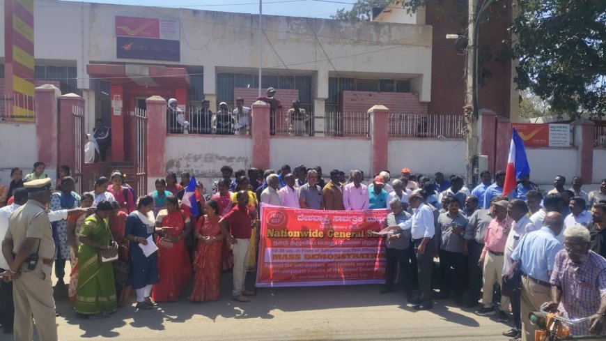 ಕೆಜಿಎಫ್: ಕೇಂದ್ರ ಸರ್ಕಾರ ಜಾರಿಗೆ ತಂದಿರುವ ಕಾರ್ಮಿಕ ಕಾಯ್ದೆಗಳನ್ನು ಖಂಡಿಸಿ ಕೆಜಿಎಫ್ ನಗರದ ರಾಬರ್ಸನ್ ಪೇಟೆ ಪೋಸ್ಟ್ ಆಫೀಸ್ ಮುಂಭಾಗ ಜೆ.ಸಿ.ಟಿ.ಯು. ವತಿಯಿಂದ ಬೃಹತ್ ಪ್ರತಿಭಟನೆ.