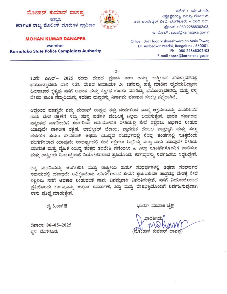 ಬೆಂಗಳೂರು: 07, ದೇಶದ ಪ್ರವಾಸಿ ತಾಣ ಜಮ್ಮು ಕಾಶ್ಮೀರದ ಪಹಲ್ಗಾಮ್‌ ನಲ್ಲಿ ಭಯೋತ್ಪಾದಕರು ದಾಳಿ ನಡೆಸಿ ದೇಶದ ಅಮಾಯಕ 26 ಜನರನ್ನು ಹತ್ಯೆ ಜನರನ್ನು ಹತ್ಯೆ ಮಾಡಿದ ಹೃದಯವಿದ್ರಾವಕ ಹಿಂಸಾಚಾರ ಕೃತ್ಯವು ದೇಶದ ಶಾಂತಿ ನೆಮ್ಮದಿಯನ್ನು ಕದಡಿದ್ದು ಪಾಕಿಸ್ತಾನದೊಂದಿಗೆ ಯುದ್ಧ ಸಾರಿದಲ್ಲಿ ದೇಶ ರಕ್ಷಣೆಗೆ ಸ್ವಯಂಸೇವಕರಾಗಿ ತೆಗೆದುಕೊಳ್ಳುವಂತೆ ಕರ್ನಾಟಕ ರಾಜ್ಯ ಪೊಲೀಸ್ ದೂರುಗಳ ಪ್ರಾಧಿಕಾರದ ಸದಸ್ಯರಾದ ಮೋಹನ್ ಕುಮಾರ್ ದಾನಪ್ಪನವರು ರಾಷ್ಟ್ರಪತಿಗಳಿಗೆ ಪತ್ರ ಬರೆದಿದ್ದಾರೆ,