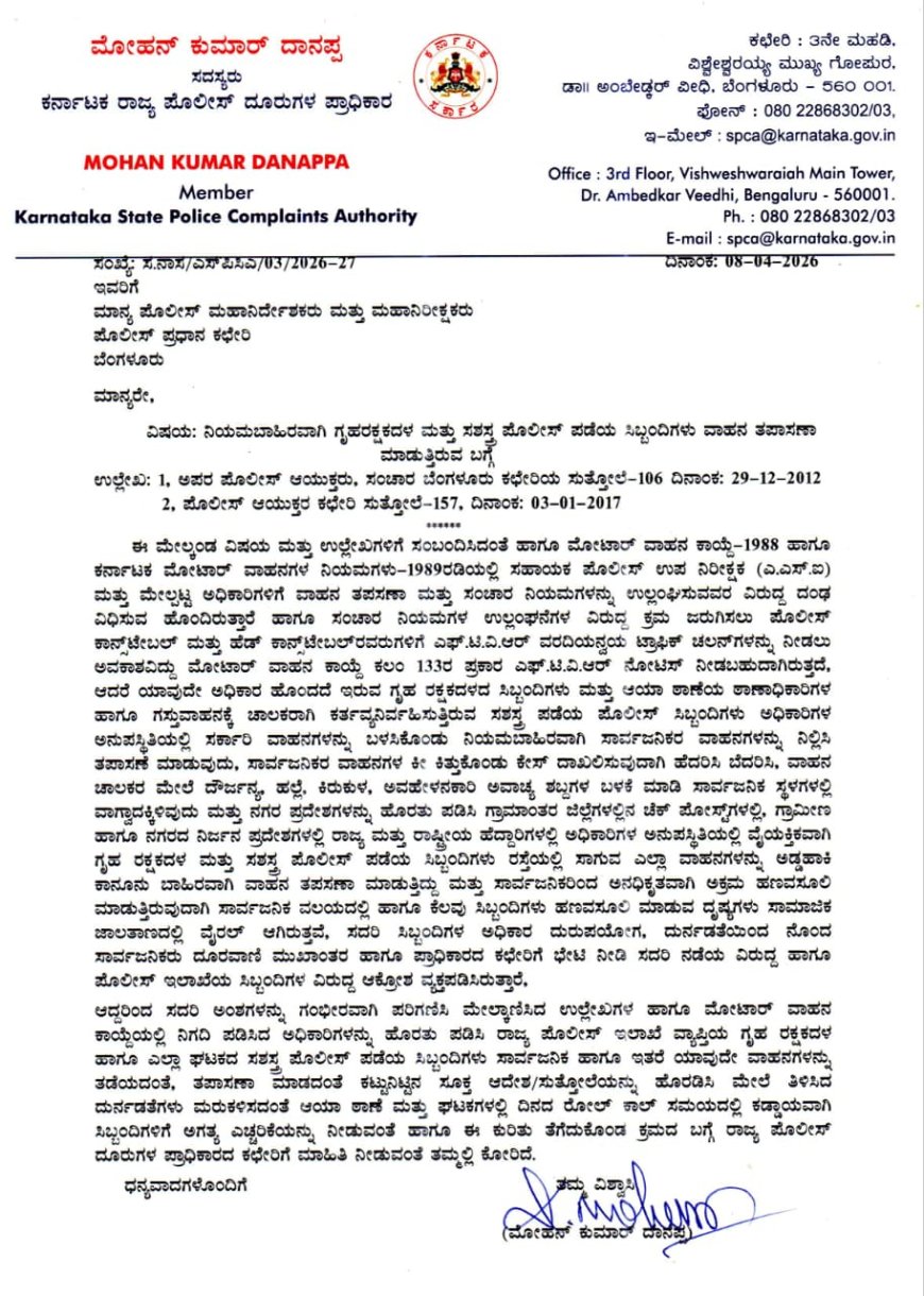 ಸದಸ್ಯರಾದ ಮೋಹನ್ ಕುಮಾರ್ ದಾನಪ್ಪನವರು ರಾಜ್ಯದ ಡಿಜಿಪಿ ಗೆ ಬರೆದ ಪತ್ರದಲ್ಲಿ ತಿಳಿಸಿದ್ದಾರೆ.